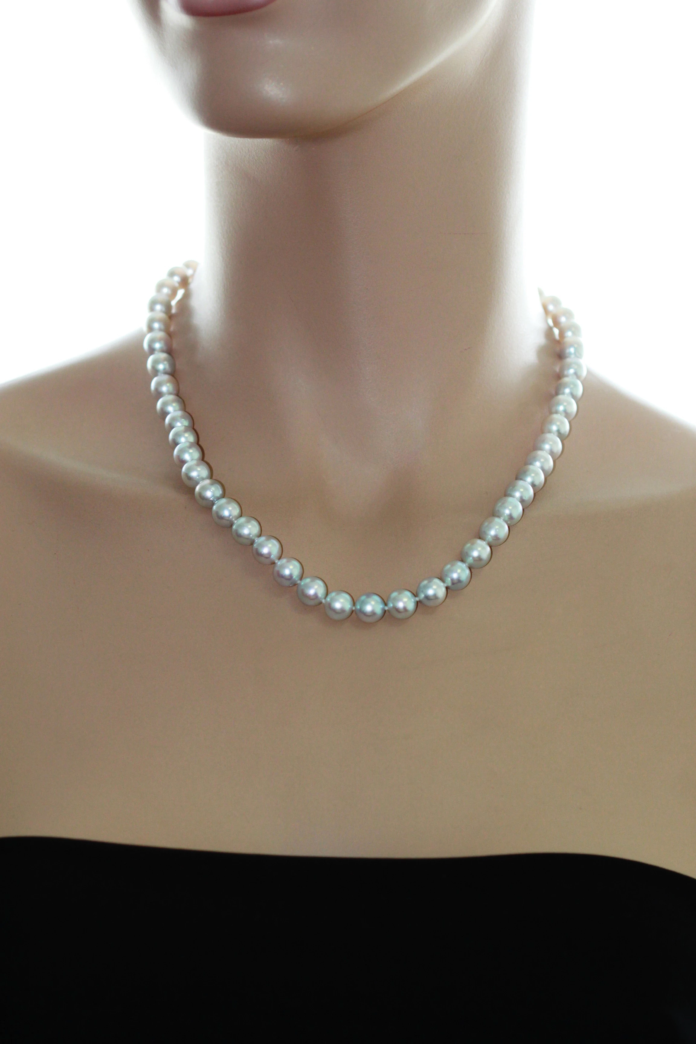 Классическое ожерелье собрано из натуральных морских жемчужин серебристого цвета, рожденных в теплых водах океана у берегов Японии. Данный вид жемчуга называется Акойя (Akoya) и считается самым ярким жемчугом в мире. Все жемчужины в колье имеют идеальную сферическую форму и ровную, гладкую поверхность с минимальным количеством дефектов. Качество жемчуга в данном ожерелье наивысшее.
