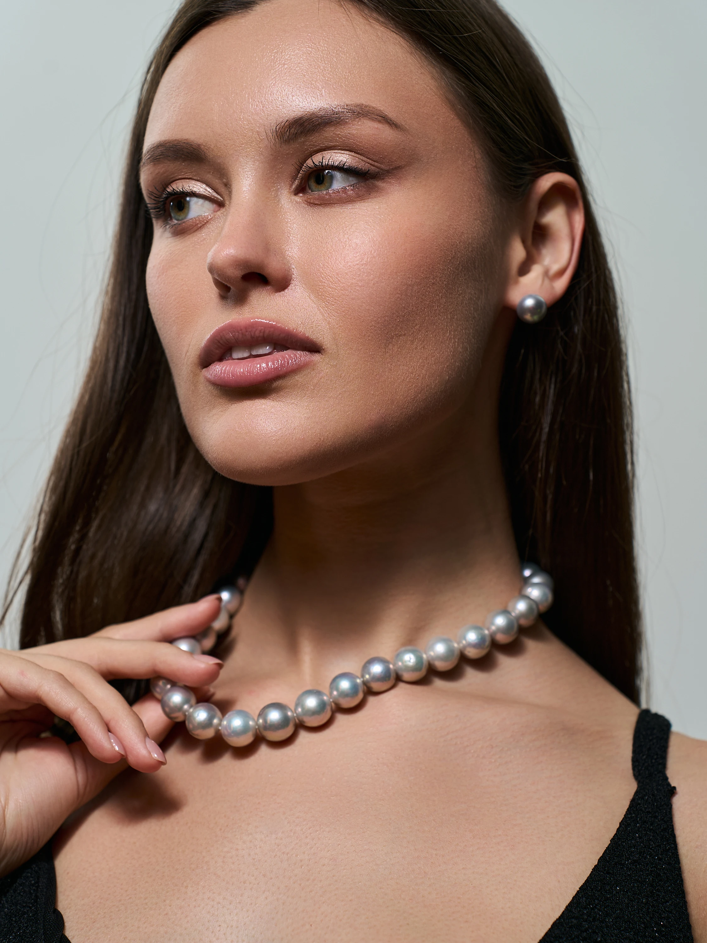 Ожерелье собрано из круглых пресноводных серебристых жемчужин.