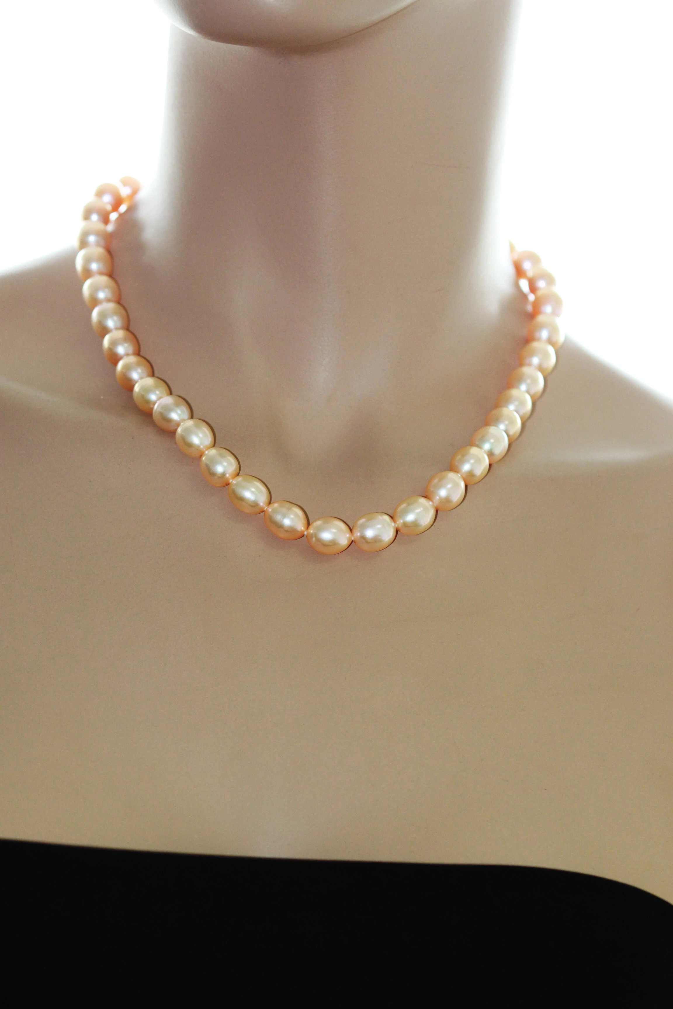 Классическое жемчужное ожерелье собрано из отборных жемчужин пресной воды. В колье подобраны жемчужины в форме риса персикового оттенка. Жемчужины имеют ровную поверхность и яркий блеск.