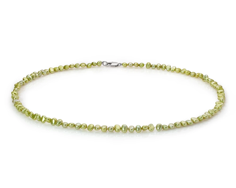Ожерелье из пресноводного жемчуга фисташкового цвета. Каждая жемчужина в данном колье имеет уникальную форму, яркий блеск и ровную для данного вида жемчуга поверхность.