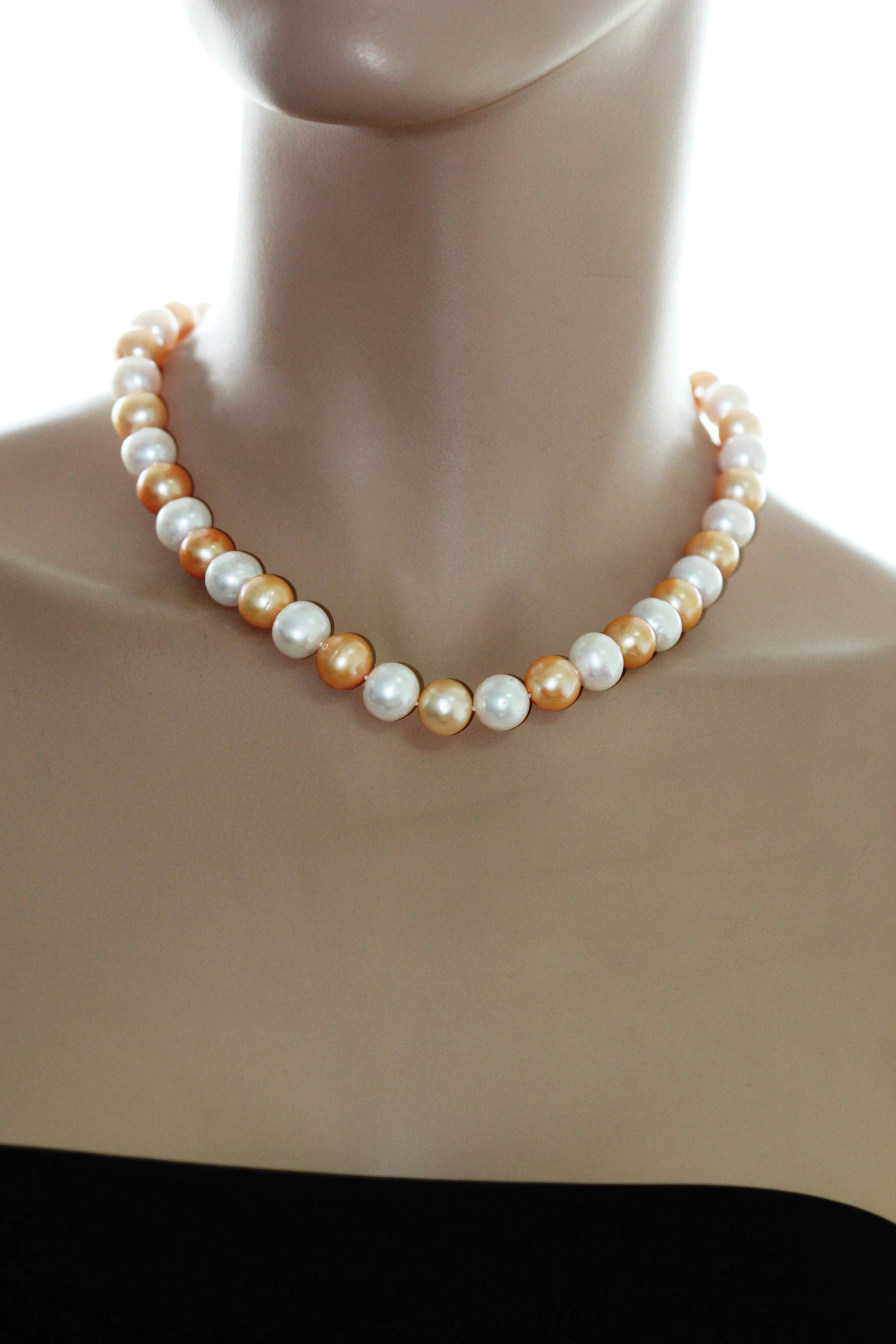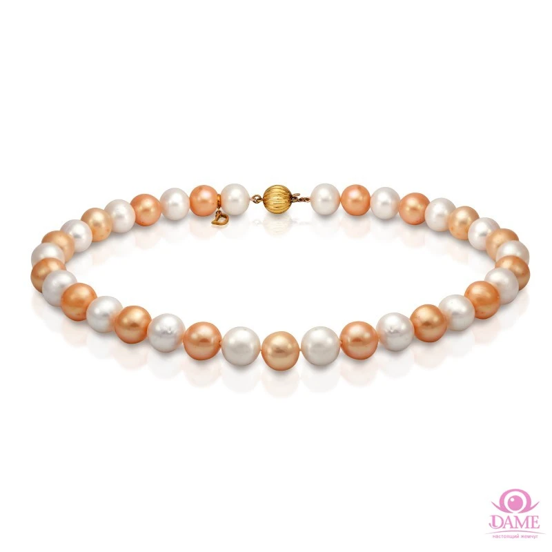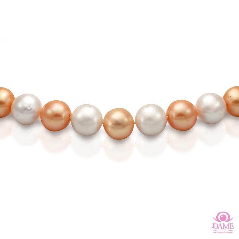 Классическое жемчужное ожерелье собрано из отборных жемчужин пресной воды. В колье со вкусом подобраны идеально круглые жемчужины белого и золотистого цвета. Жемчужины имеют ровную поверхность и яркий блеск.