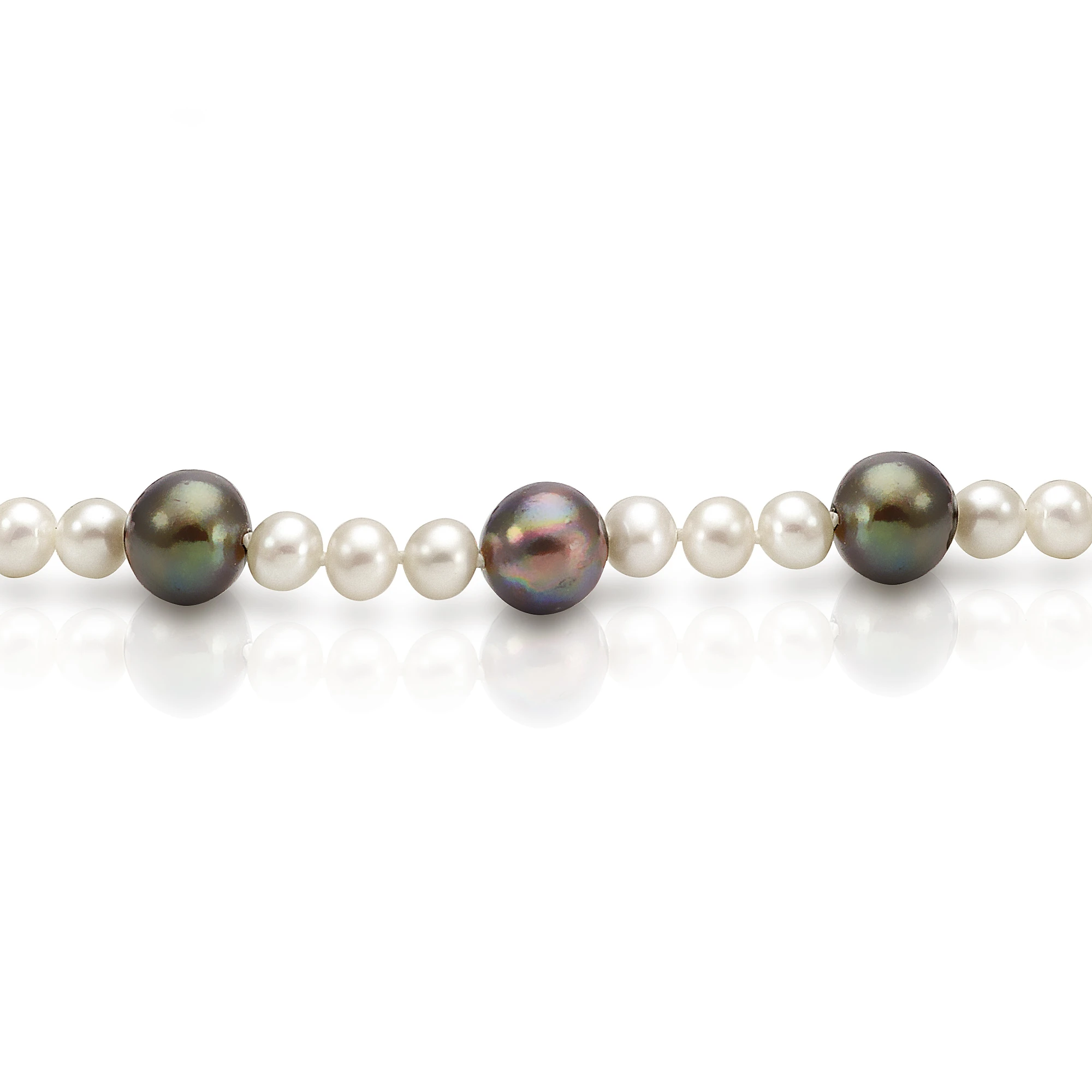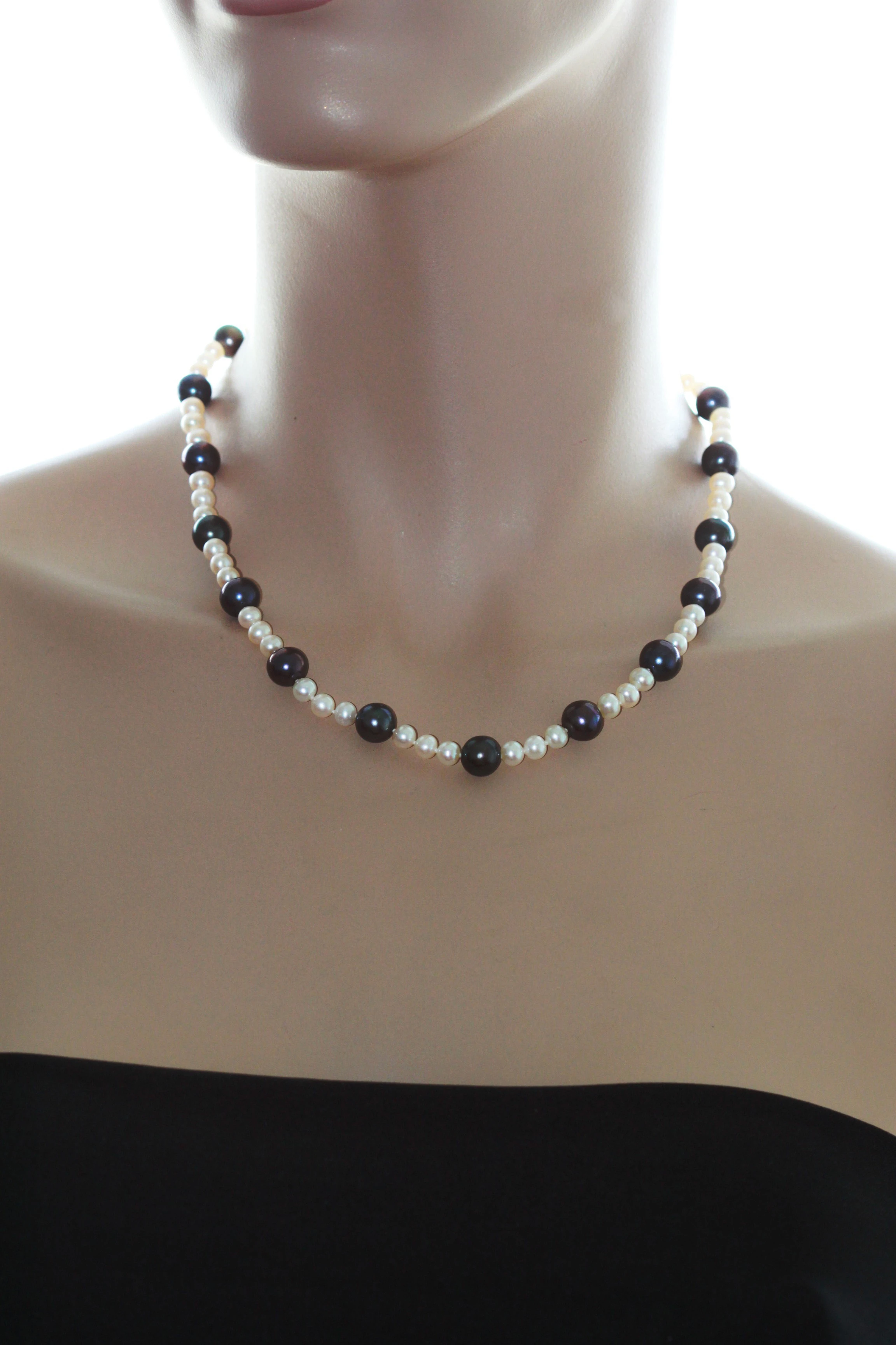 Ожерелье собрано из высококачественных пресноводных жемчужин. Наши дизайнеры в этой модели совместили жемчуг двух цветов (белый и черный) и двух диаметров (крупный и мелкий). Изюминка данного ожерелья в получившемся модном контрасте белого и черного.