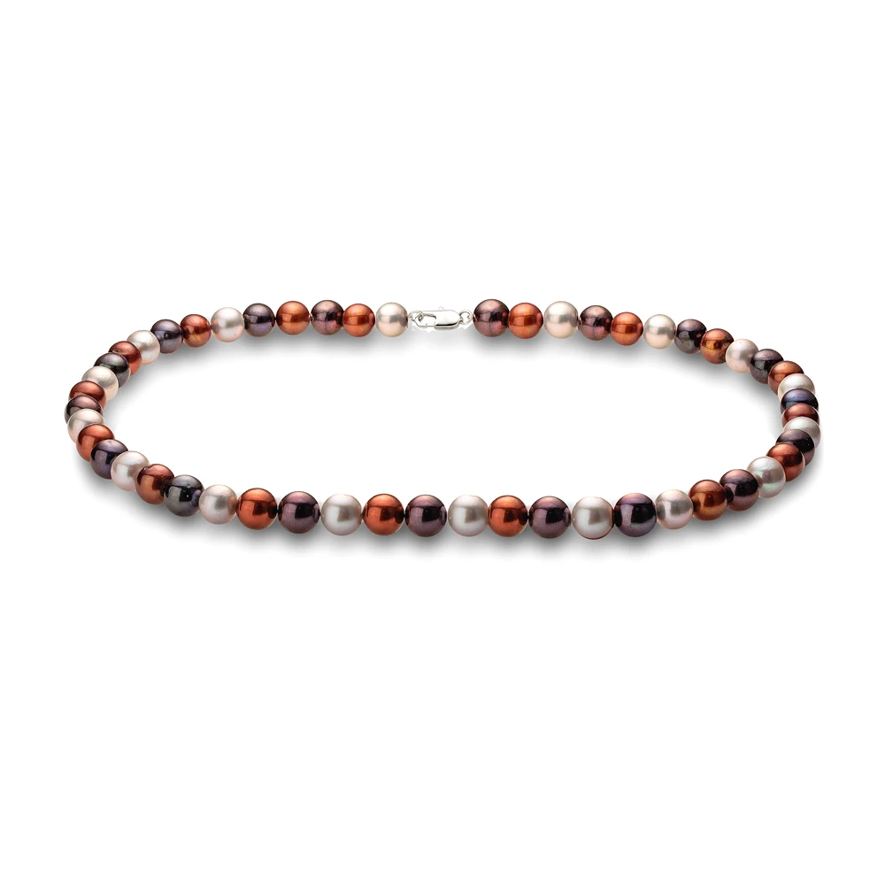 Классическое жемчужное ожерелье собрано из отборных серебристых, шоколадных и черных речных жемчужин (пресной воды), выращенных в Южном Китае. Жемчужины имеют ровную поверхность и очень яркий перламутровый блеск. Качество жемчужин в колье наивысшее, количество природных изъянов на поверхности жемчуга минимальное.