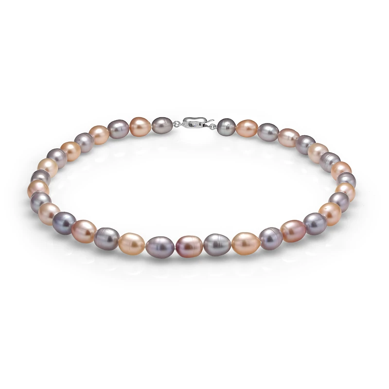Классическое жемчужное ожерелье собрано из отборных жемчужин пресной воды. В колье подобраны жемчужины в форме риса серебристого и розового цвета. Жемчужины имеют ровную поверхность и яркий блеск.