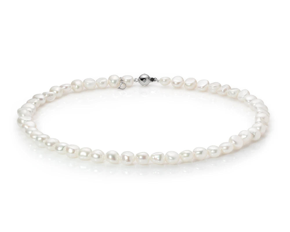Ожерелье собрано из пресноводного белого жемчуга неправильной формы "Барокко". Каждая жемчужина в данном колье имеет свою неповторимую форму, яркий перламутровый блеск и ровную для данного вида жемчуга поверхность. Качество жемчужин в колье наивысшее, количество природных изъянов на поверхности жемчуга минимальное.