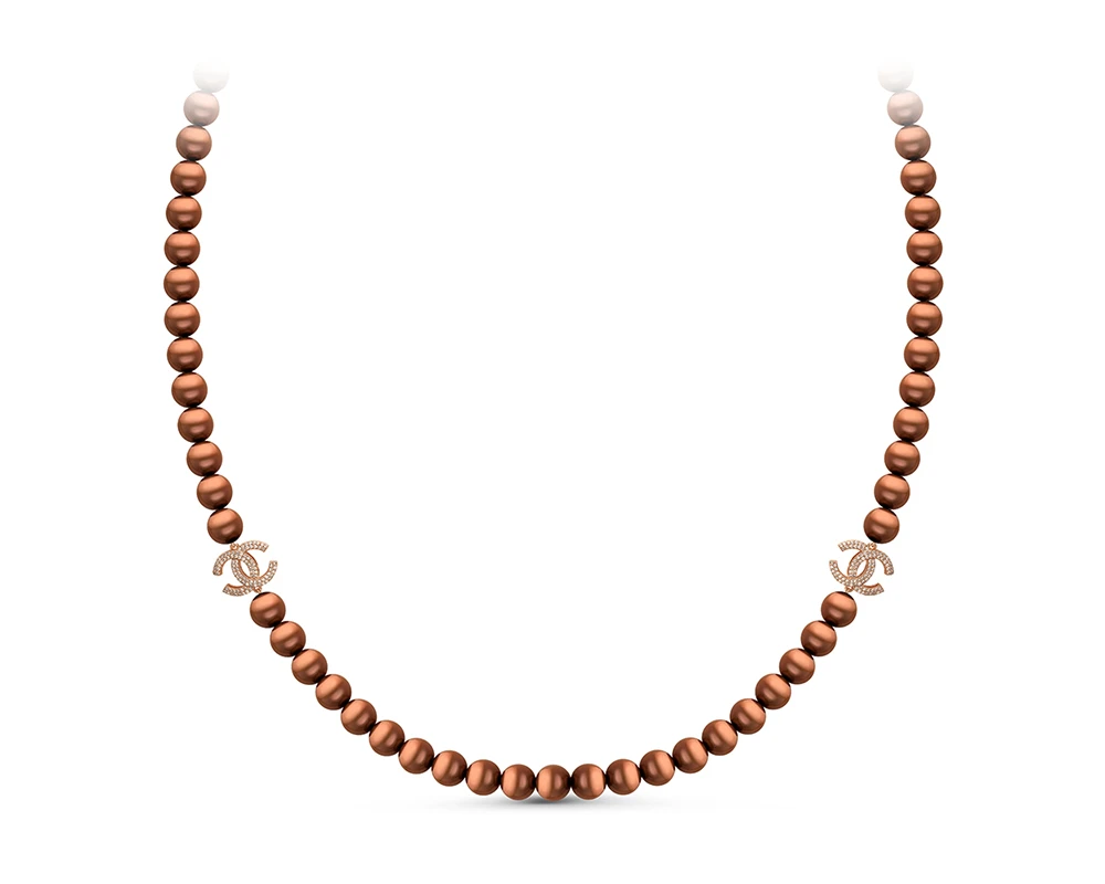 Стильное колье собрано из шоколадного жемчуга и украшено вставками из серебра 925 пробы с фианитами и золотым покрытием «красное золото».