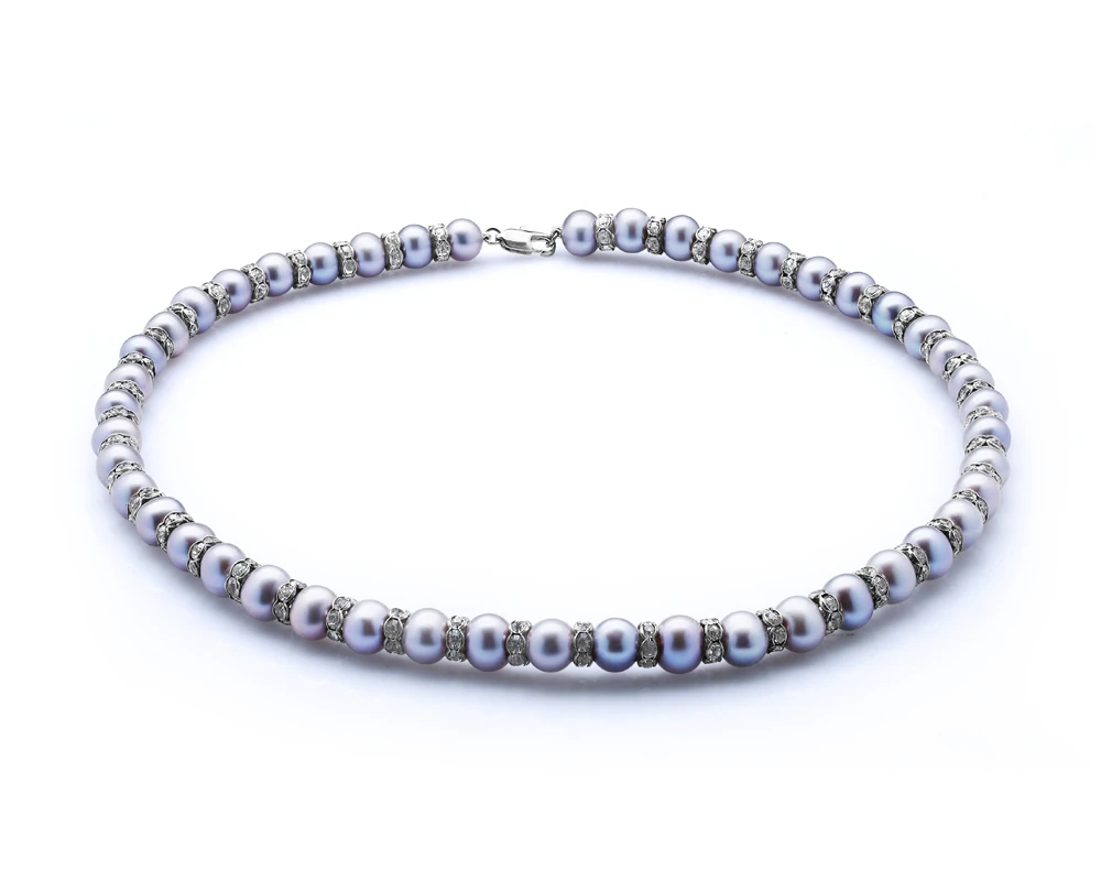 Ожерелье из серебристого круглого жемчуга со стразами. Жемчужины 8-8,5 мм, (3224(18500))