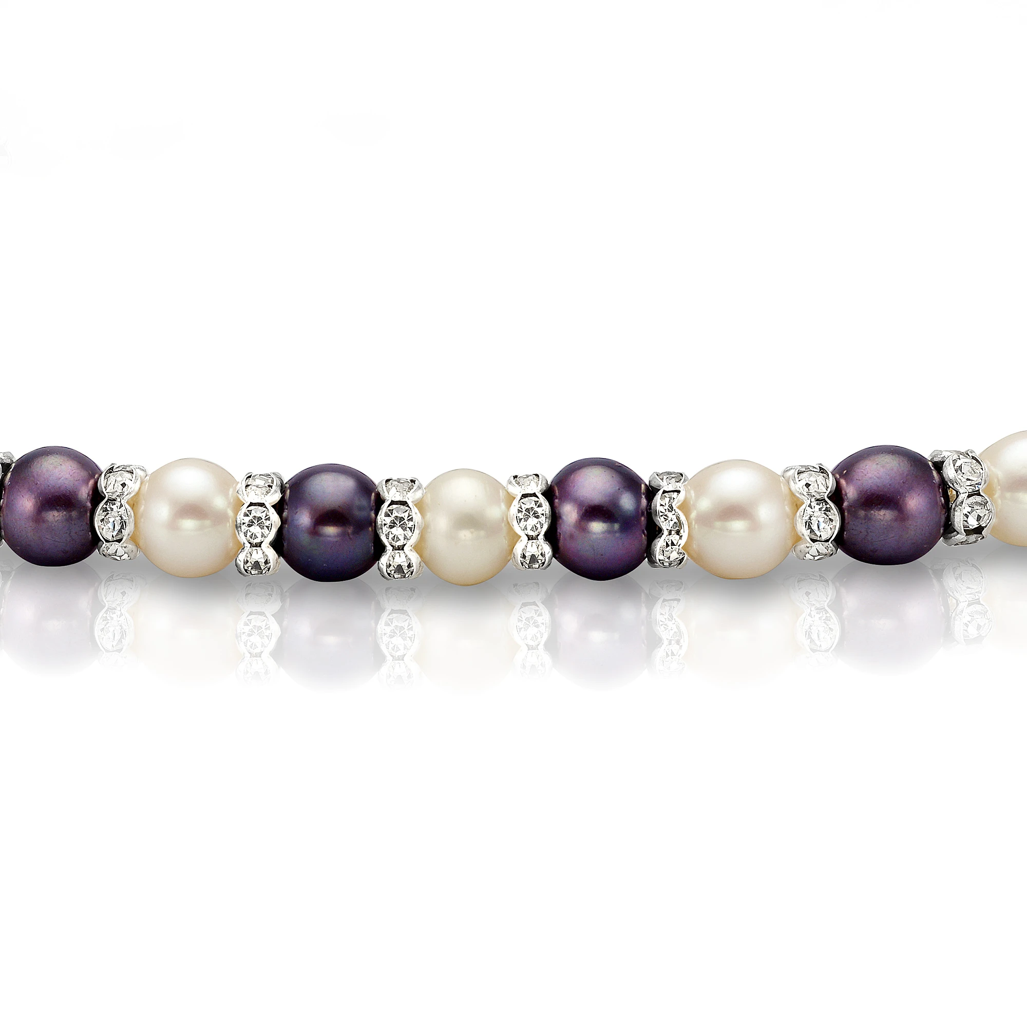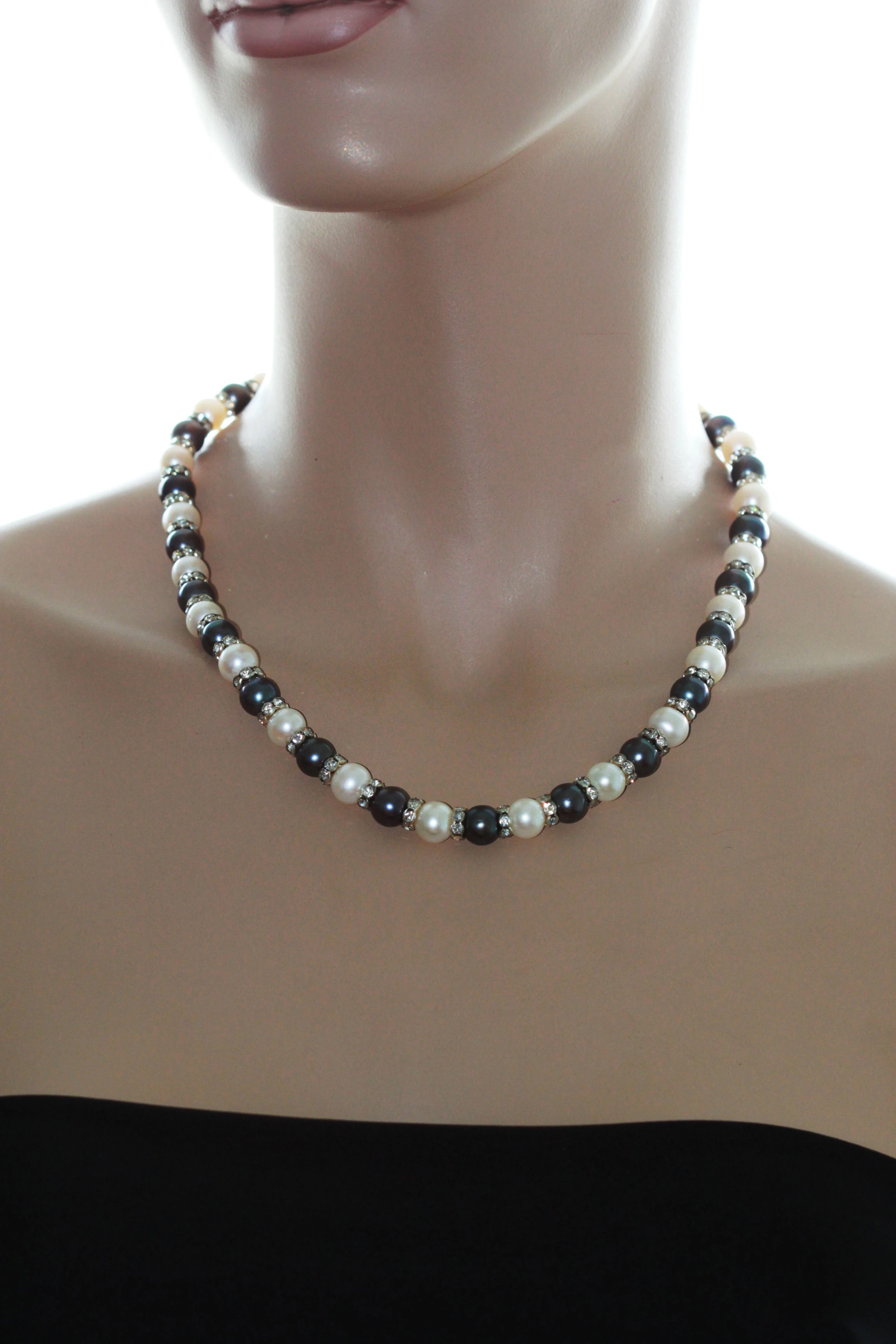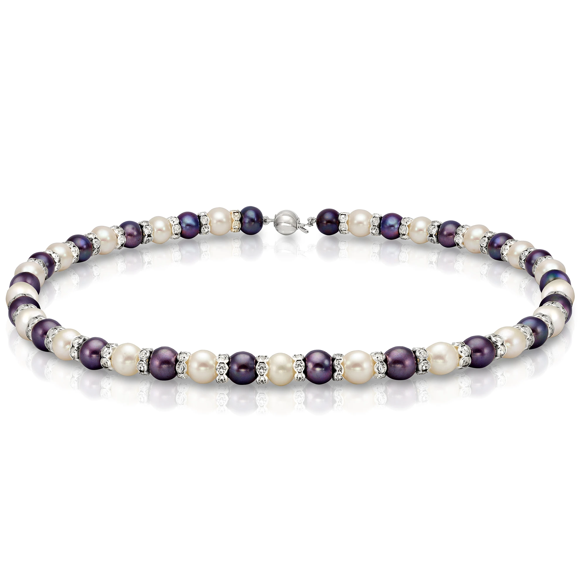 Ожерелье собрано из отборных речных жемчужин белого и черного цветов и украшено стразами из ювелирного сплава с фианитами.