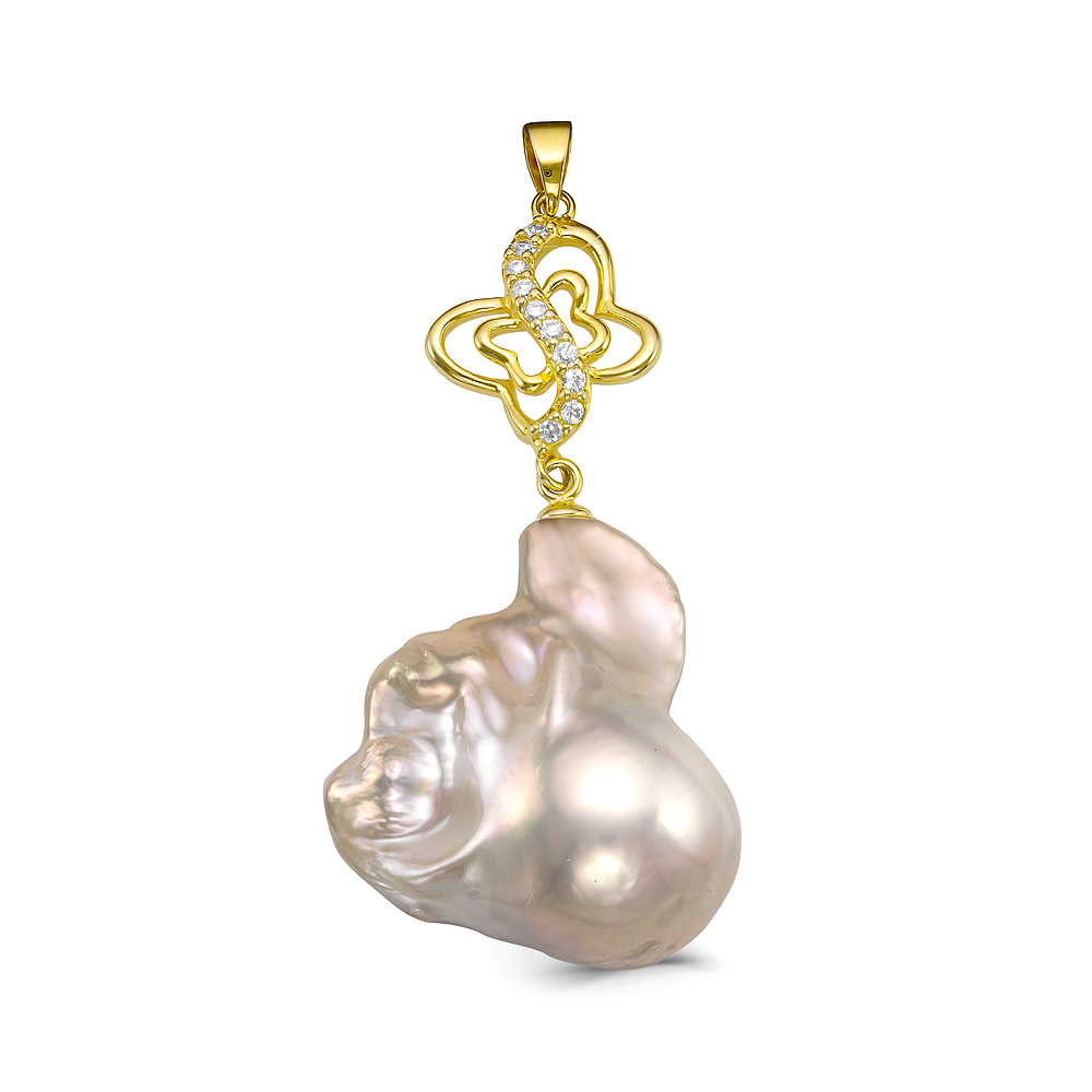Подвеска выполнена из серебра 925 пробы с желтым покрытием, украшена фианитами и барочной пресноводной жемчужиной. Высота — 5,5 см.