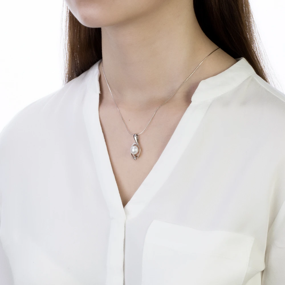 Подвеска выполнена из серебра 925 пробы, украшена фианитами и белой пресноводной жемчужиной. Высота кулона - 2,7 см.