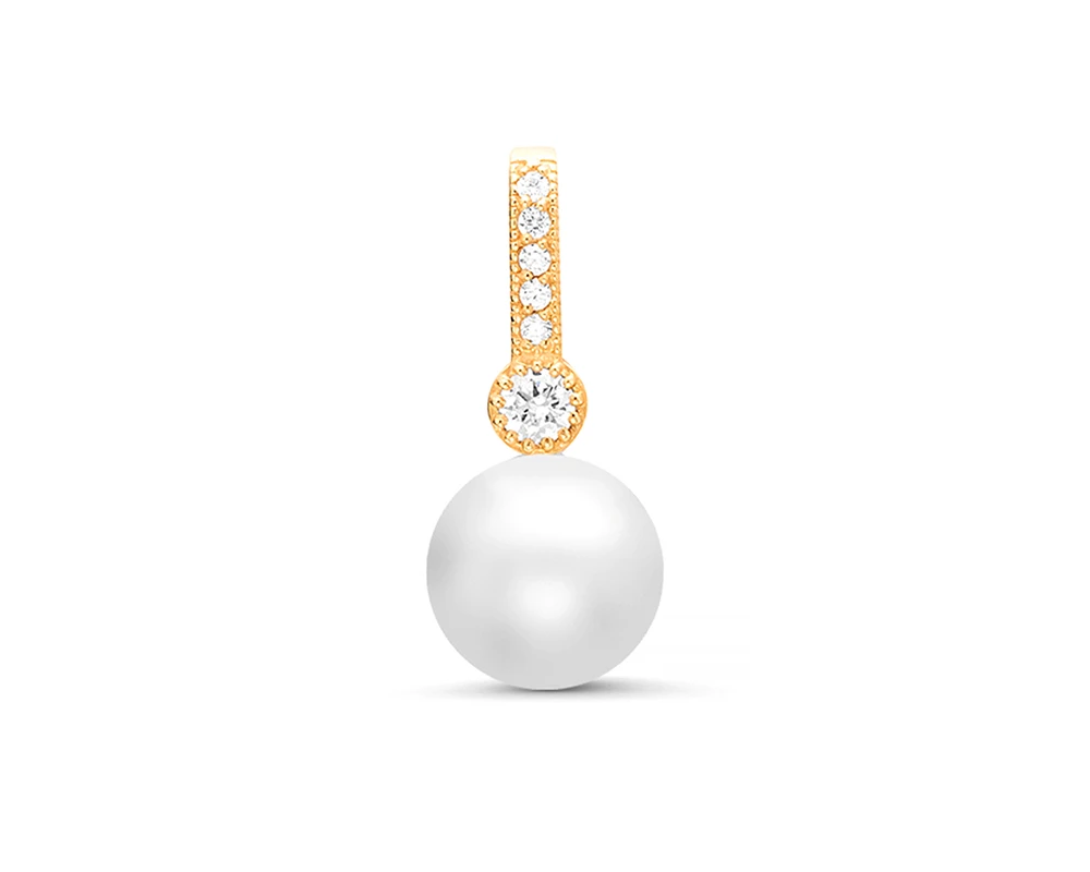 Подвеска выполнена из серебра 925 пробы с золотым покрытием, украшена фианитами и круглой белой пресноводной жемчужиной. Высота кулона - 2,2 см.