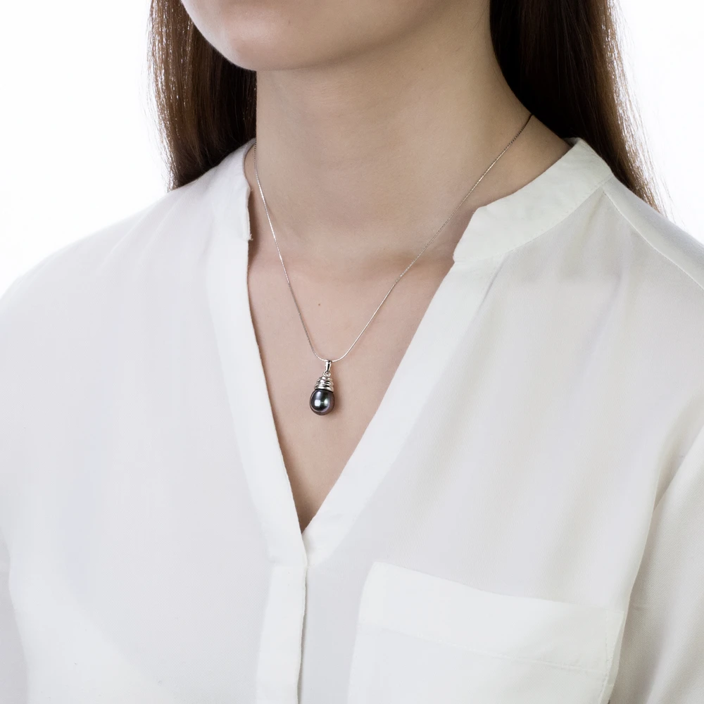 Подвеска выполнена из серебра 925 пробы, украшена каплевидной морской жемчужиной. Качество жемчужины — очень высокое, жемчужина обладает ярким блеском и неповторимым цветом морского Таитянского жемчуга. Высота кулона - 2,5 см.
