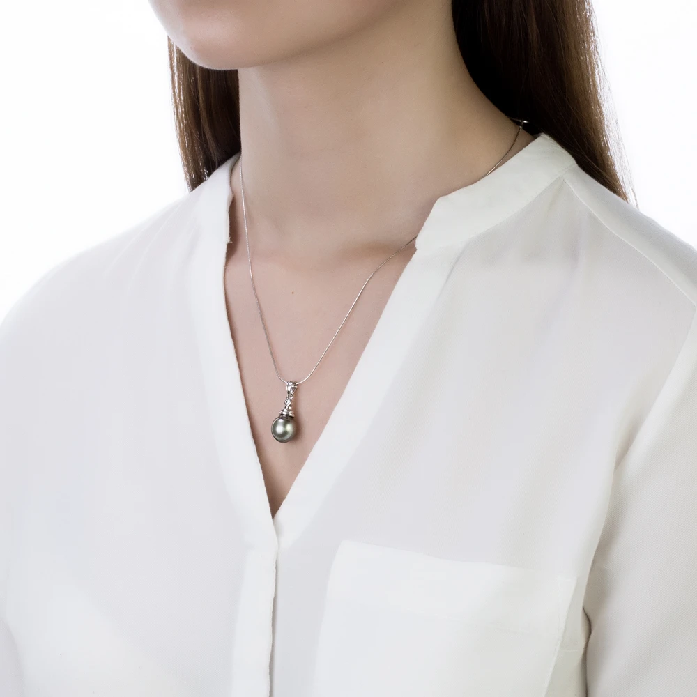 Подвеска выполнена из серебра 925 пробы, украшена черной морской жемчужиной. Качество жемчужины очень высокое, жемчужина имеет яркий блеск и неповторимый цвет морского Таитянского жемчуга. Высота кулона - 2,6 см.
