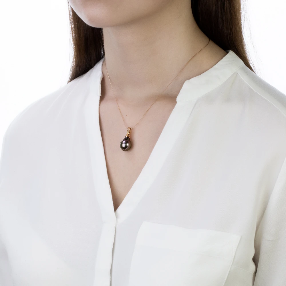 Подвеска выполнена из серебра 925 пробы c золотым покрытием «красное золото», украшена черной морской жемчужиной. Качество жемчужины очень высокое, жемчужина имеет яркий блеск и неповторимый цвет морского Таитянского жемчуга. Вставки — фианиты. Производство — Россия. Высота кулона - 2,5 см.