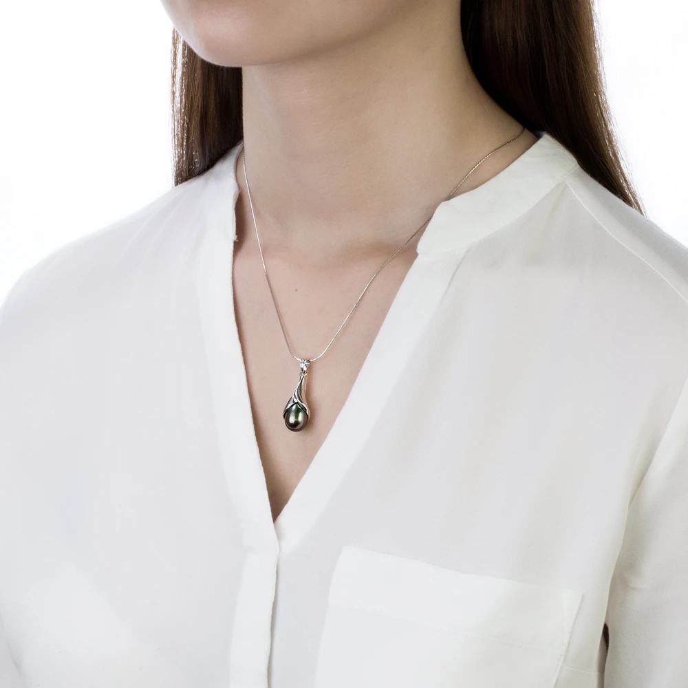 Подвеска выполнена из серебра 925 пробы, украшена каплевидной черной морской жемчужиной. Качество жемчужины — очень высокое, яркий блеск и неповторимый цвет морского Таитянского жемчуга. Высота кулона - 3,3 см.