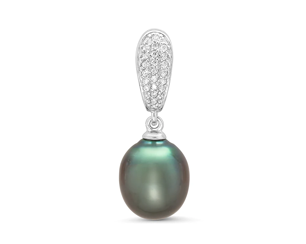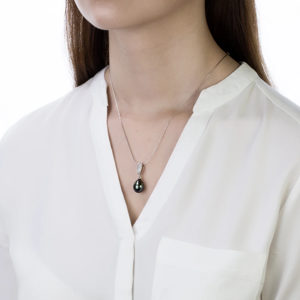 Подвеска выполнена из серебра 925 пробы, украшена черной морской жемчужиной. Качество жемчужины очень высокое, жемчужина имеет яркий блеск и неповторимый цвет морского Таитянского жемчуга. Высота кулона — 2,8 см.