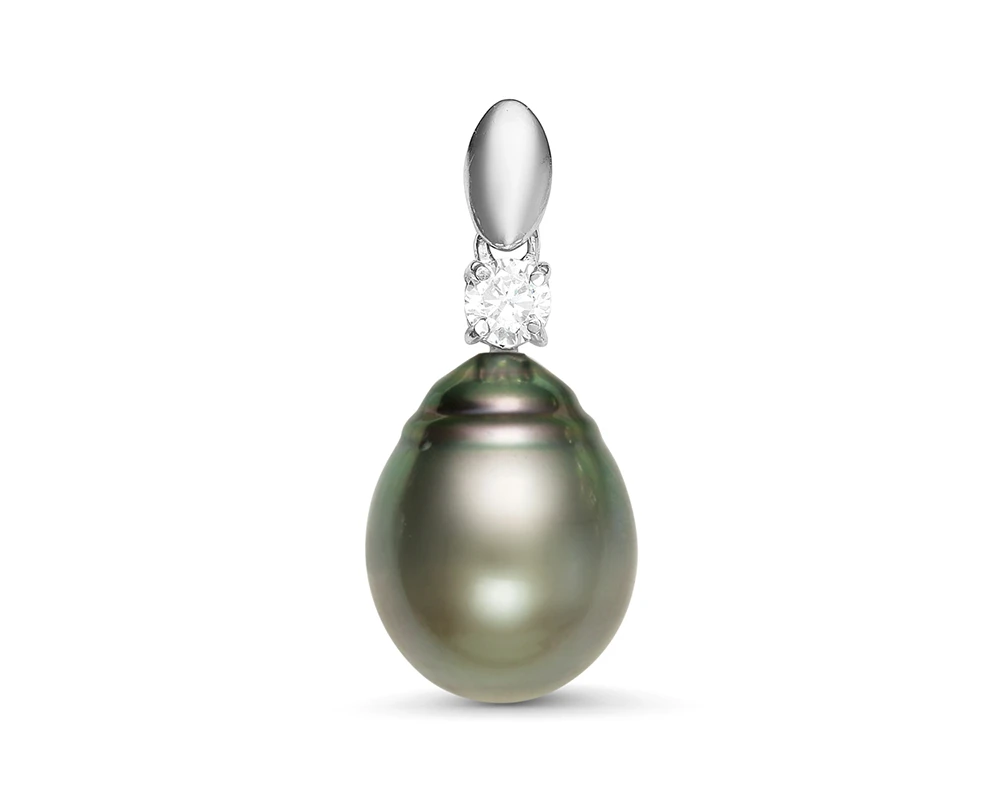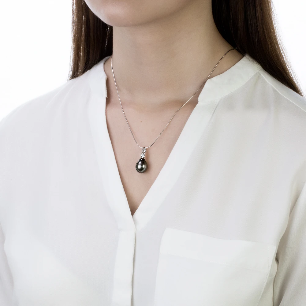Подвеска выполнена из серебра 925 пробы, украшена черной морской жемчужиной. Жемчужина имеет яркий блеск и неповторимый цвет морского Таитянского жемчуга. Высота кулона — 2,7 см.