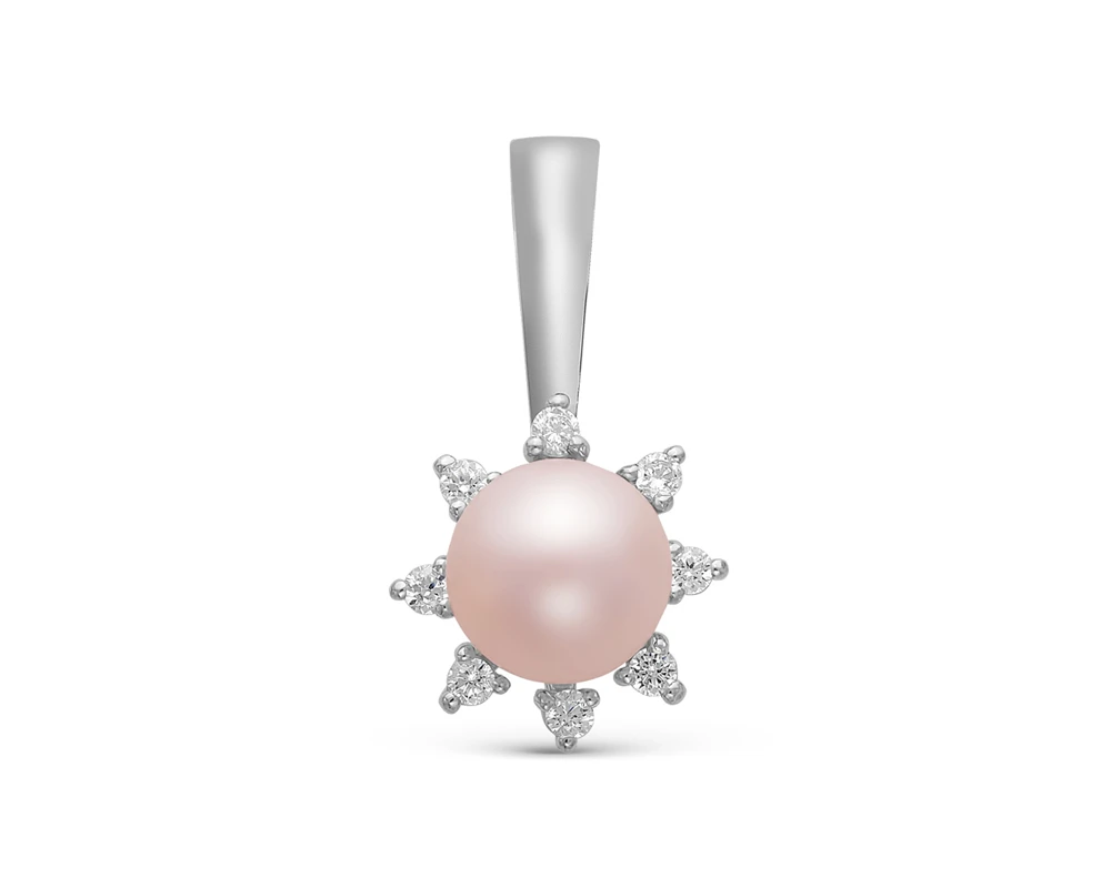 Подвеска выполнена из серебра 925 пробы, украшена фианитами и круглой розовой пресноводной жемчужиной. Высота кулона - 1,9 см.