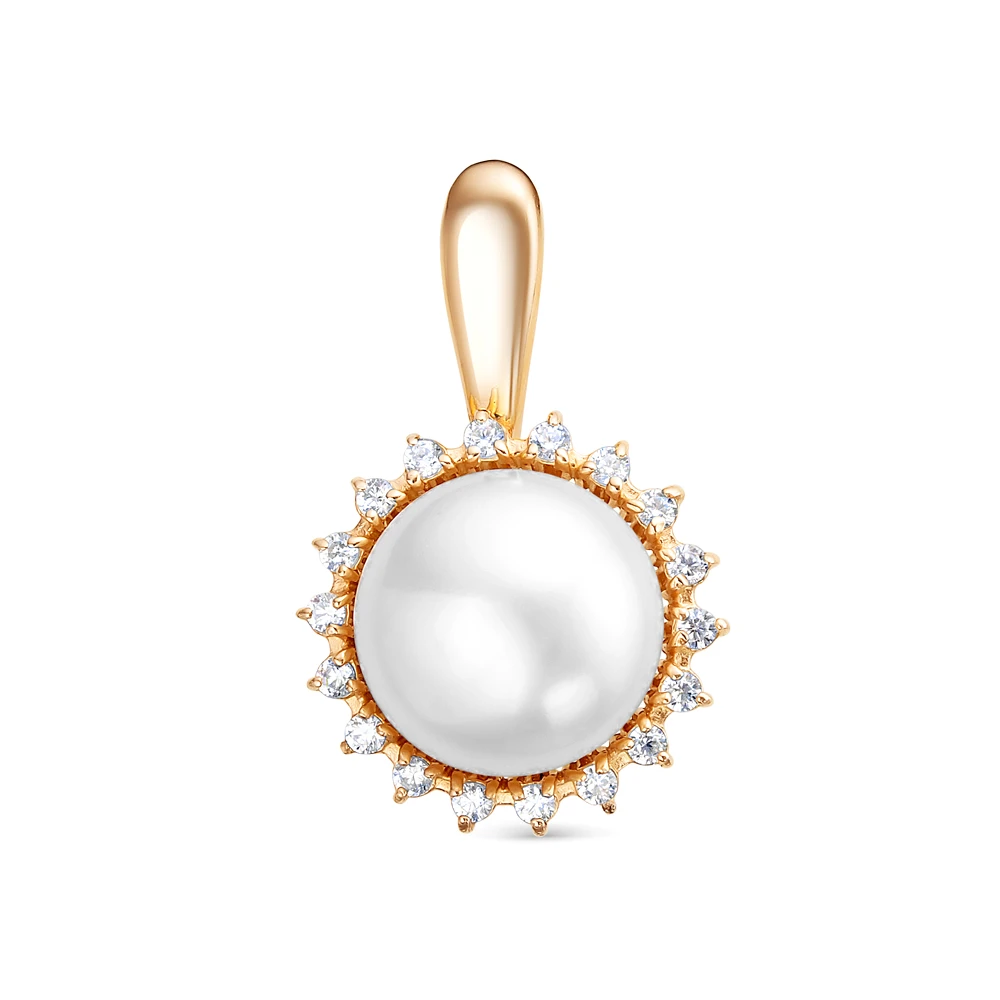 Подвеска выполнена из серебра 925 пробы с красным золотым покрытием, украшена фианитами и белой пресноводной жемчужиной.