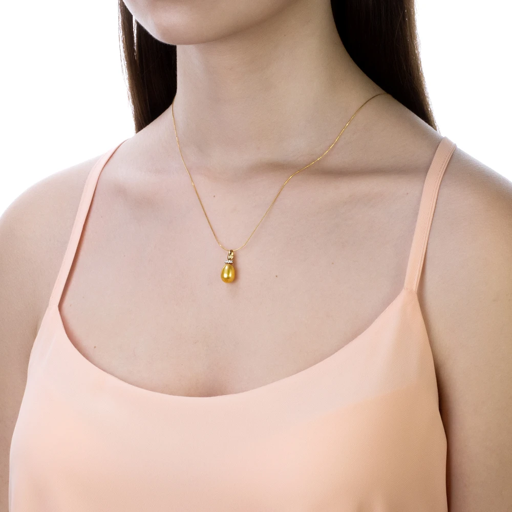 Подвеска выполнена из серебра 925 пробы с желтым золотым покрытием, украшена фианитами и золотистой каплевидной пресноводной жемчужиной. Высота кулона - 2 см.