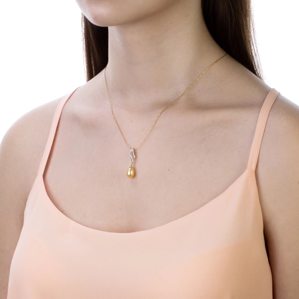 Подвеска выполнена из серебра 925 пробы, украшена фианитами и золотистой каплевидной пресноводной жемчужиной. Высота кулона - 3 см.