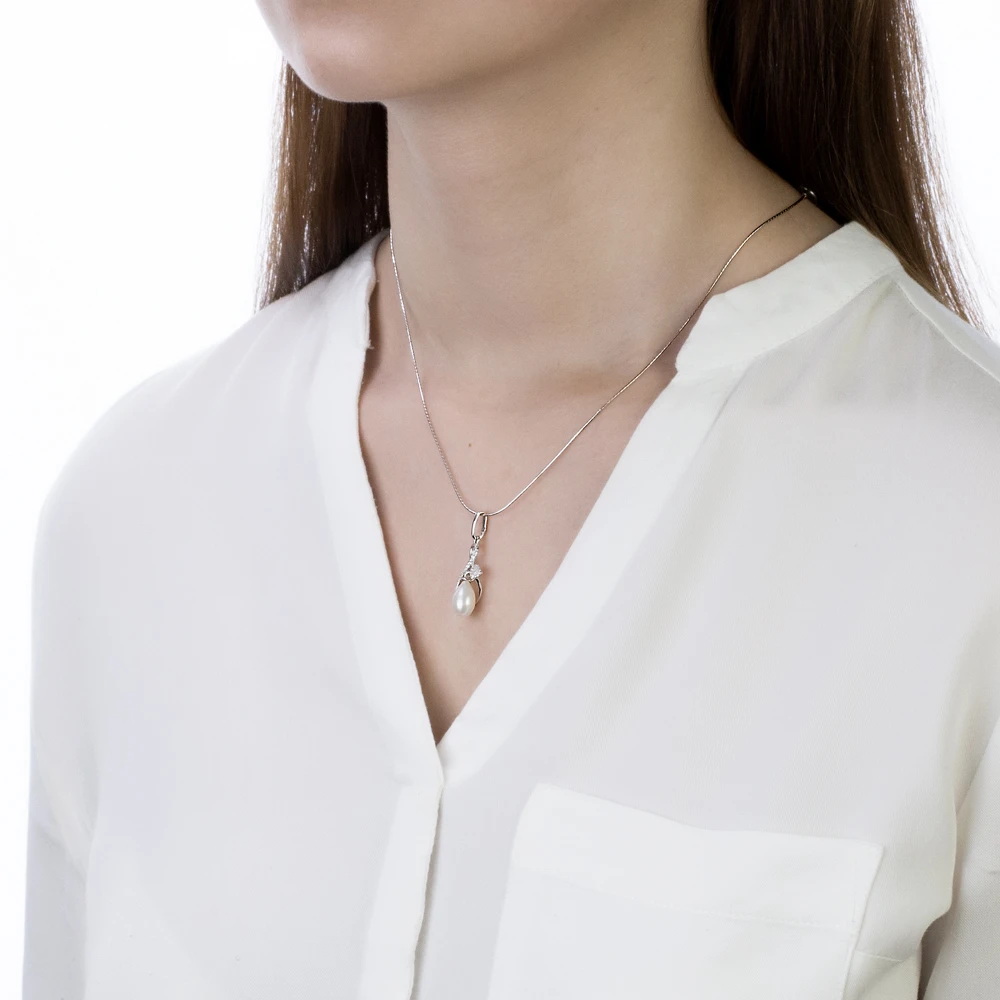 Подвеска выполнена из серебра 925 пробы, украшена каплевидной пресноводной жемчужиной. Длина кулона — 3 см.