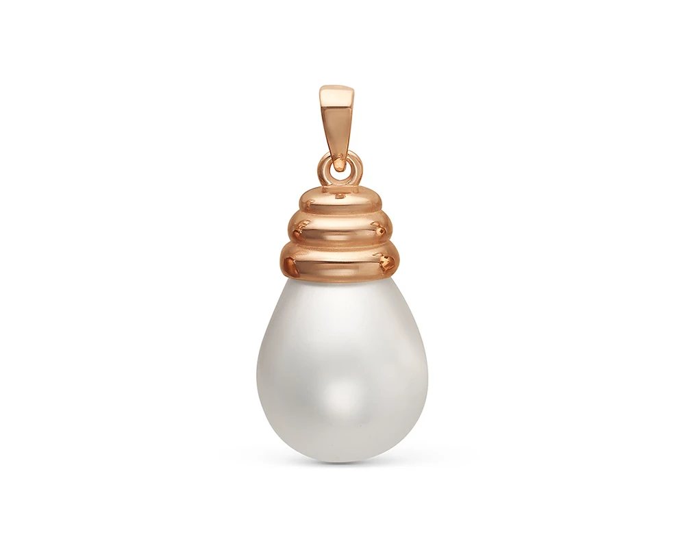 Кулон изготовлен из серебра 925 пробы с красным золотым покрытием и украшен каплевидной искусственной жемчужиной «Майорика» белого цвета. Высота кулона - 2,7 см.