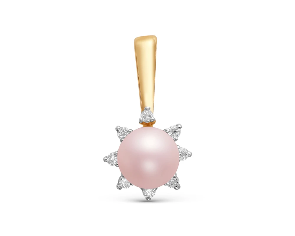 Подвеска выполнена из серебра 925 пробы с желтым золотым покрытием, украшена фианитами и круглой розовой пресноводной жемчужиной. Высота кулона - 1,9 см.