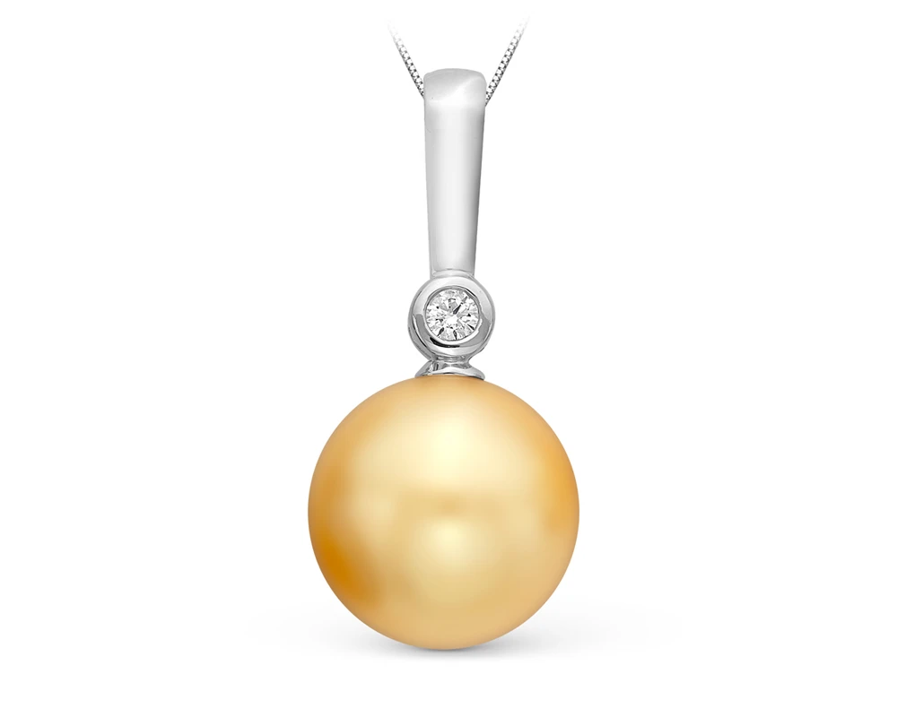 Подвеска выполнена из белого золота 750 пробы и украшена золотистой морской Австралийской жемчужиной идеальной сферической формы. Жемчужина имеет очень яркий блеск, гладкую поверхность, класс жемчужины можно считать наивысшим.