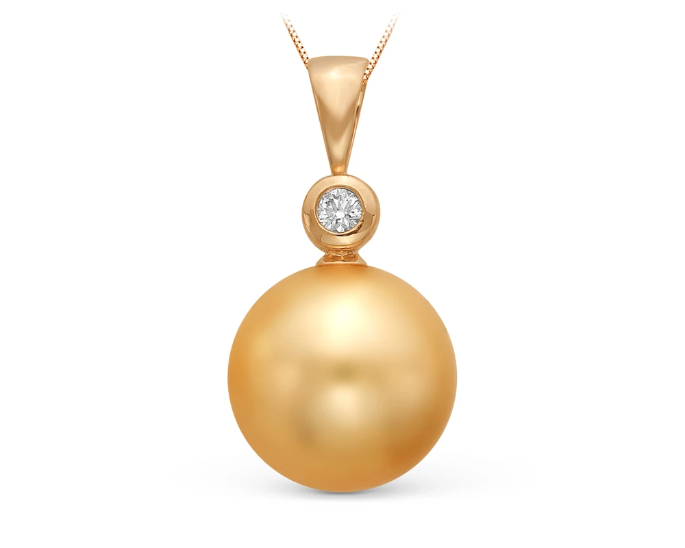 Подвеска выполнена из красного золота 750 пробы и украшена золотистой морской Австралийской жемчужиной идеальной сферической формы. Жемчужина имеет очень яркий блеск, гладкую поверхность, класс жемчужины можно считать наивысшим. Высота кулона - 2,5 см.