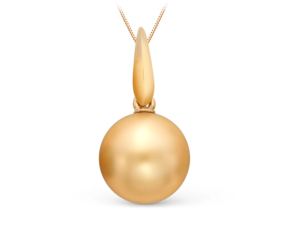 Подвеска выполнена из желтого золота 750 пробы и украшена золотистой морской Австралийской жемчужиной идеальной сферической формы. Жемчужина имеет очень яркий блеск, гладкую поверхность, класс жемчужины можно считать наивысшим.