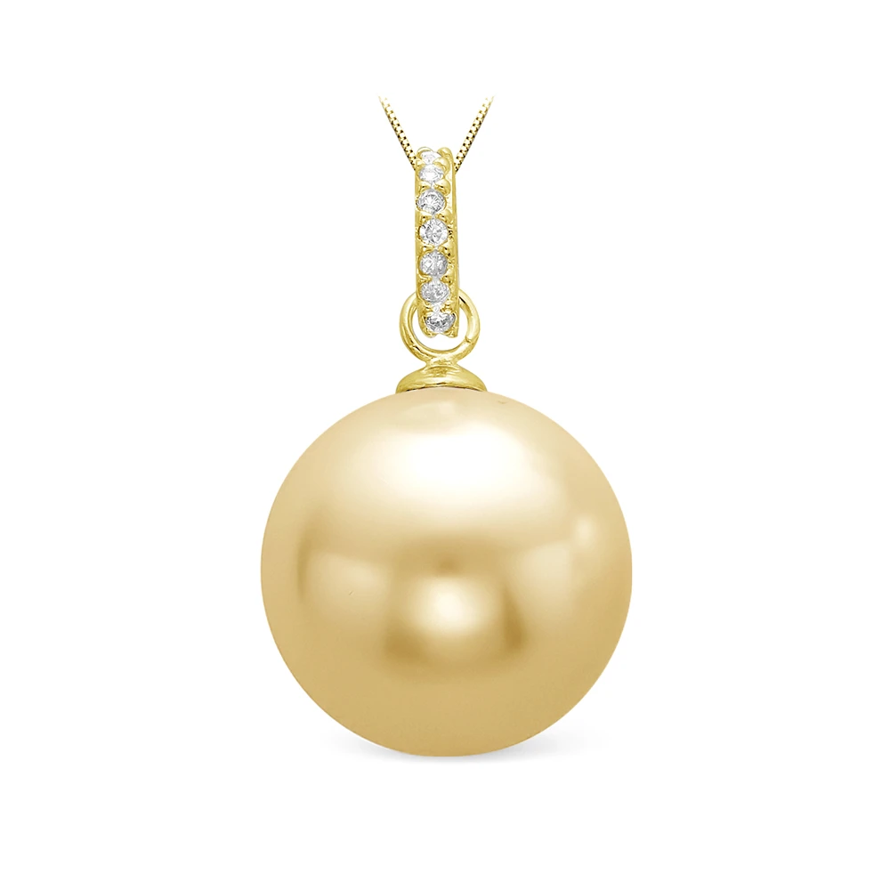 Подвеска выполнена из желтого золота 585 пробы и украшена золотистой морской Австралийской жемчужиной идеальной сферической формы. Жемчужина имеет очень яркий блеск, гладкую поверхность с незначительным количеством природных дефектов.