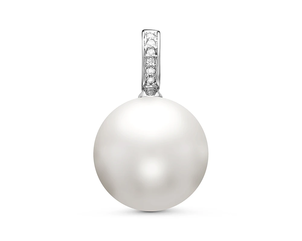 Подвеска выполнена из белого золота 585 пробы и украшена белой морской Австралийской жемчужиной идеальной сферической формы. Жемчужина имеет очень яркий блеск, гладкую поверхность, класс жемчужины можно считать наивысшим.