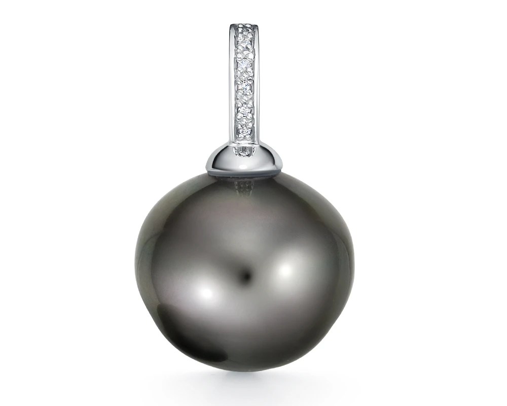 Подвеска выполнена из белого золота 585 пробы и украшена бриллиантами и черной морской Таитянской жемчужиной сплющенной формы. Жемчужина имеет очень яркий блеск, гладкую поверхность, класс жемчужины можно считать очень высоким.