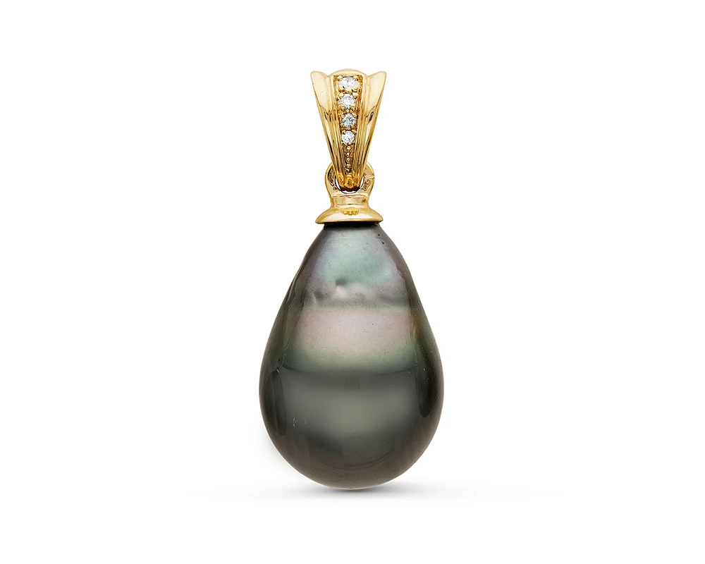 Подвеска выполнена из желтого золота 750 пробы и украшена черной морской Таитянской жемчужиной каплевидной формы. Жемчужина имеет очень яркий блеск, гладкую поверхность. Высота кулона - 3,3 см.