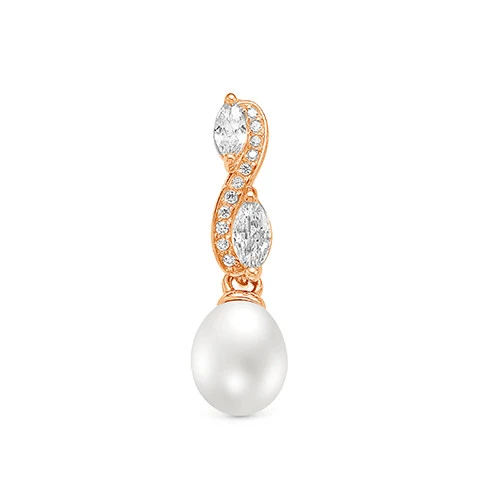 Подвеска из желтого золота 585 пробы украшена белой жемчужиной пресной воды и фианитами. Качество жемчужины наивысшее: форма идеальная «капля», блеск очень яркий, дефекты на поверхности отсутствуют.