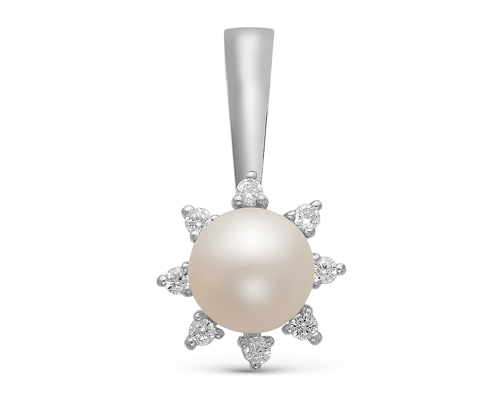 Подвеска из белого золота 585 пробы украшена круглой белой жемчужиной пресной воды и фианитами. Качество жемчужины наивысшее: форма идеальная сферическая, блеск очень яркий, дефекты на поверхности отсутствуют. Производство — Россия. Высота кулона - 1,9 см.