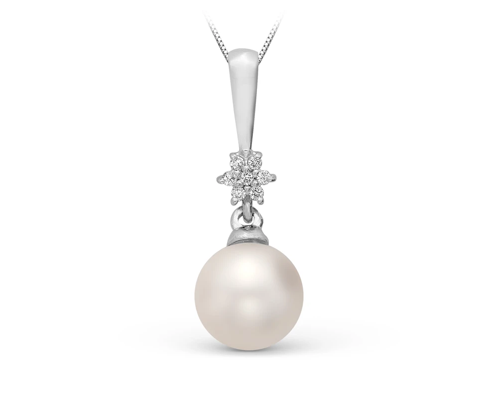 Подвеска из белого золота 585 пробы украшена круглой белой жемчужиной пресной воды и фианитами. Качество жемчужины наивысшее: форма идеальная сферическая, блеск очень яркий, дефекты на поверхности отсутствуют. Высота кулона - 2,5 см.