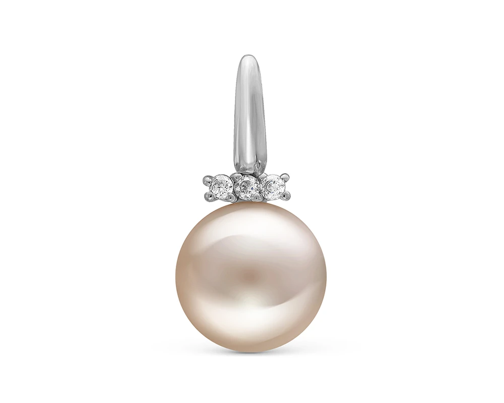 Подвеска из белого золота 585 пробы украшена круглой белой жемчужиной пресной воды и фианитами. Качество жемчужины наивысшее: форма идеальная сферическая, блеск очень яркий, дефекты на поверхности отсутствуют. Производство — Россия. Высота кулона - 1,7 см.