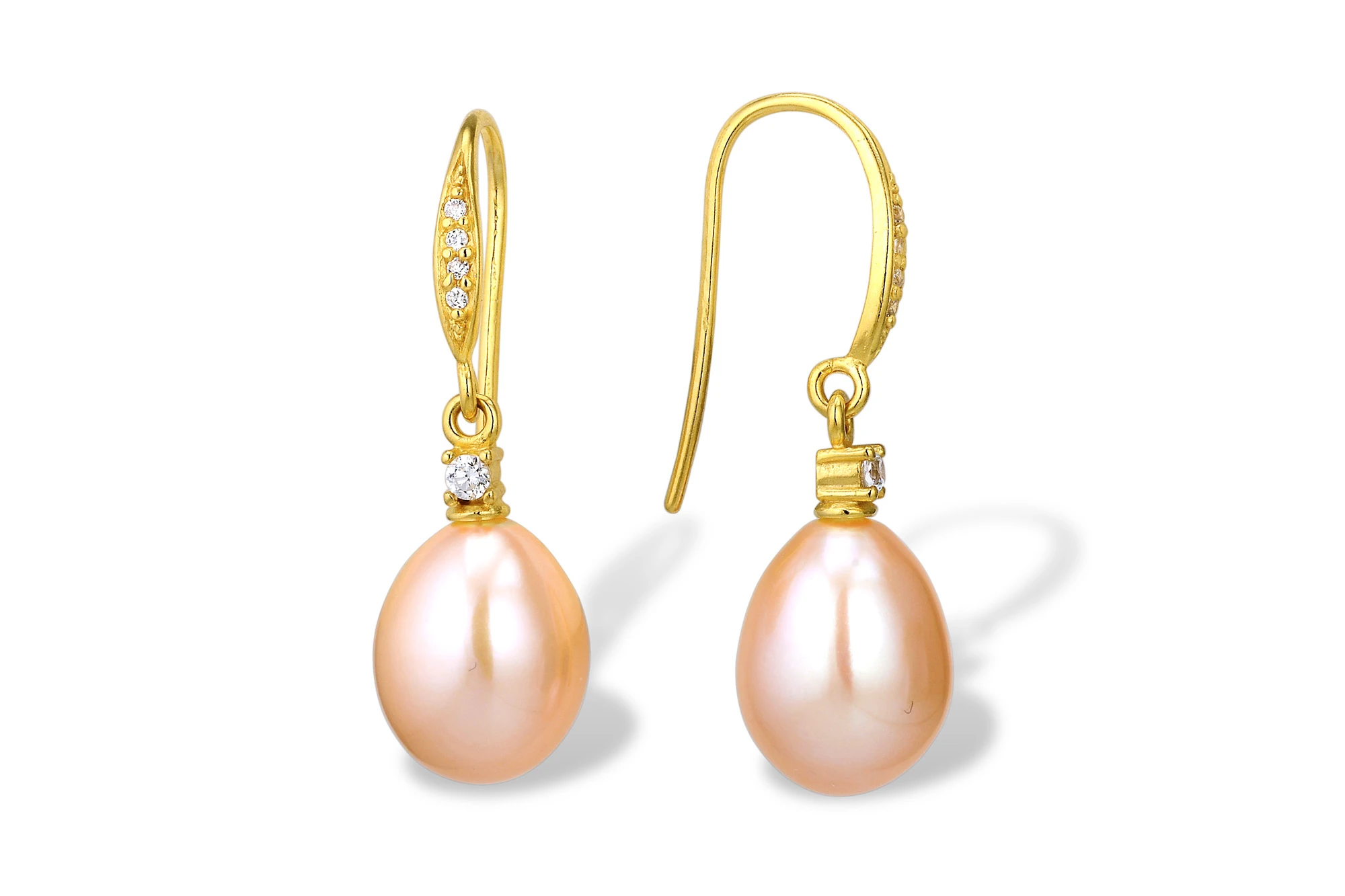 Эксклюзивные серьги выполнены из серебра 925 пробы с золотым покрытием "желтое золото", украшены фианитами и розовыми каплевидными пресноводными жемчужинами. Блеск жемчужин — очень яркий, дефектов на поверхности нет. Длина серег - 3 см.