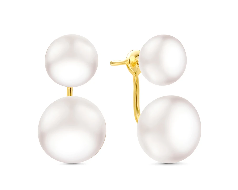 Двойные пусеты из серебра 925 пробы украшены белым пресноводным жемчугом. Форма жемчужин - "пуговица" (сплющенная), блеск перламутра очень яркий, качество жемчуга очень высокое.