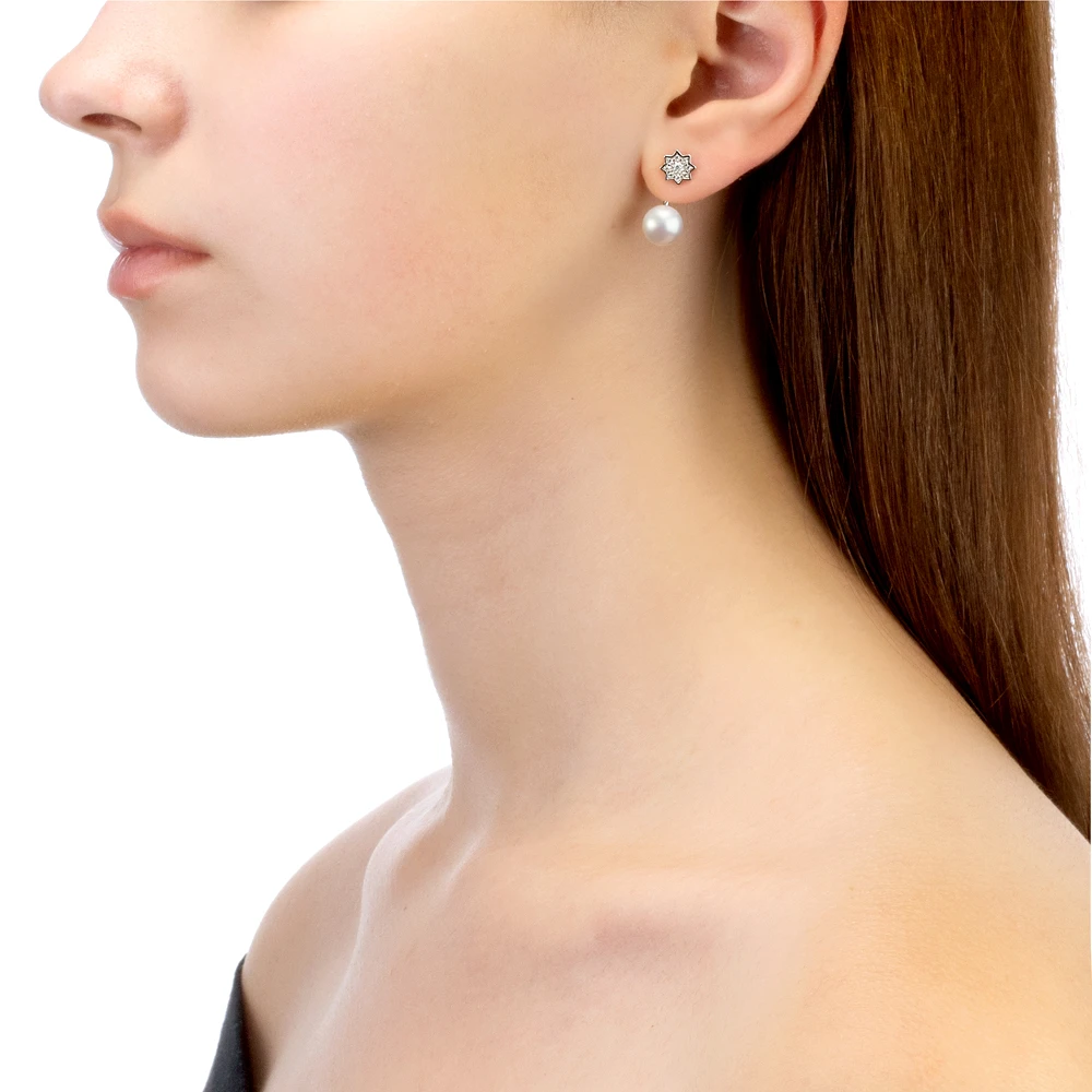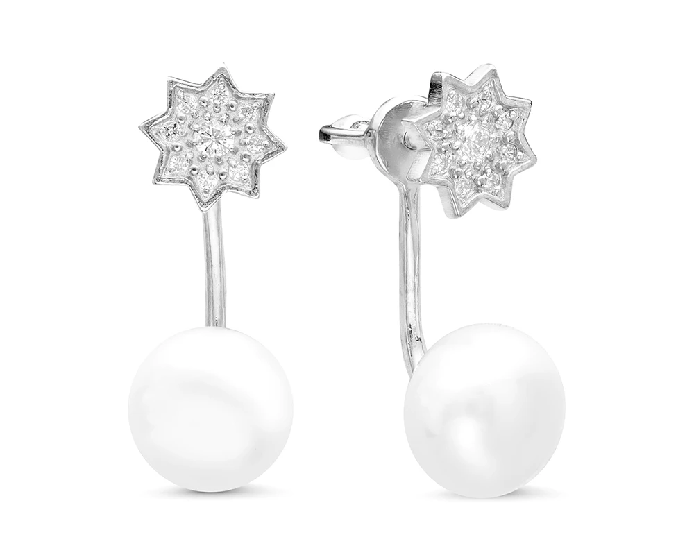 Двойные пусеты из серебра 925 пробы украшены белым пресноводным жемчугом. Форма жемчужин - "пуговица" (сплющенная), блеск перламутра очень яркий, качество жемчуга очень высокое.