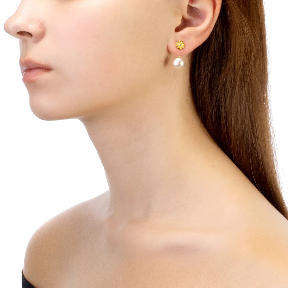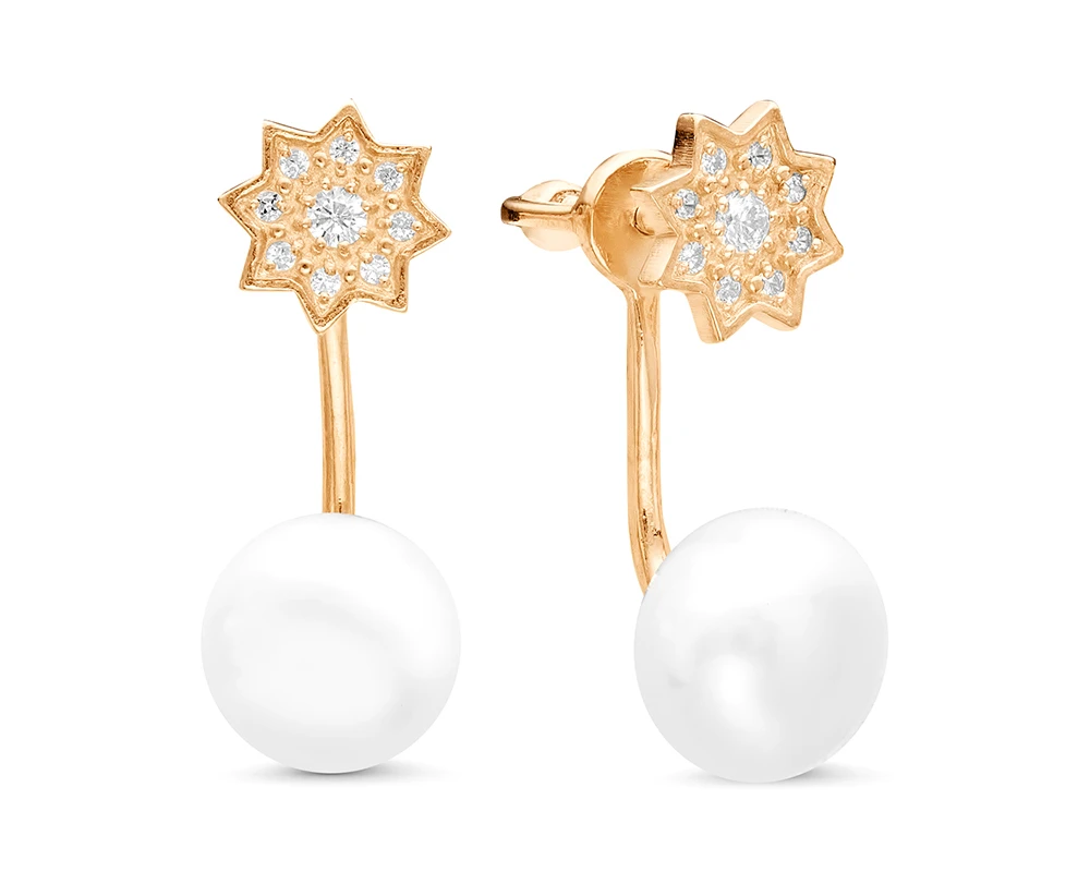 Двойные пусеты из серебра 925 пробы с покрытием «желтое золото» украшены белым пресноводным жемчугом. Форма жемчужин - "пуговица" (сплющенная), блеск перламутра очень яркий, качество жемчуга очень высокое.