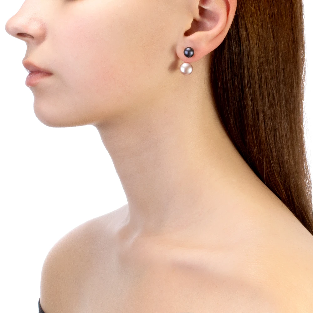 Двойные пусеты из серебра 925 пробы украшены черным и розовым пресноводным жемчугом. Форма жемчужин - "пуговица" (сплющенная), блеск перламутра очень яркий, качество жемчуга очень высокое.