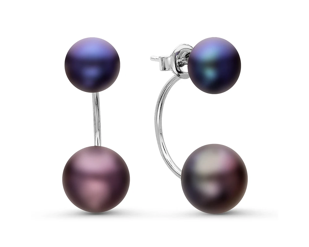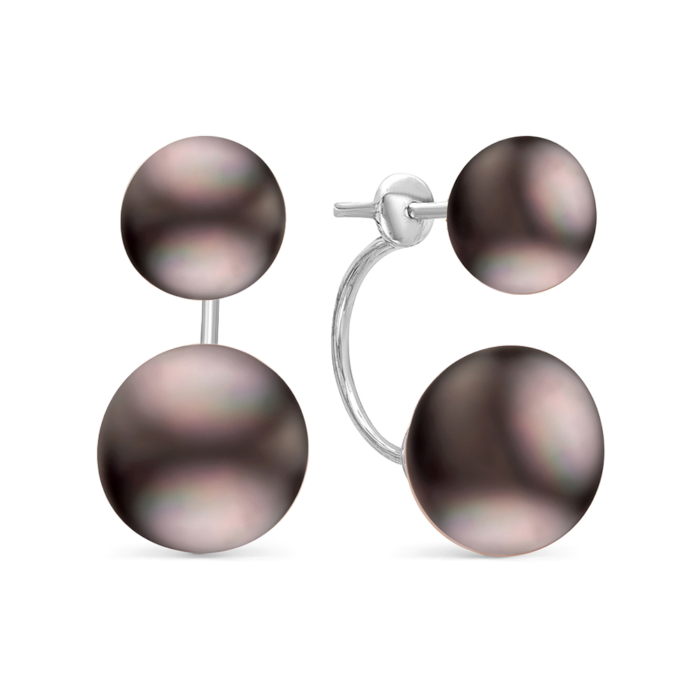 Двойные пусеты из серебра 925 пробы украшены черным пресноводным жемчугом. Форма жемчужин - "пуговица" (сплющенная), блеск перламутра очень яркий, качество жемчуга очень высокое.
