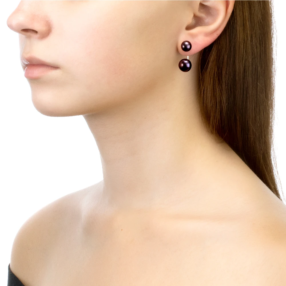 Двойные пусеты выполнены из серебра 925 пробы и украшены жемчужинами пресной воды. Качество жемчужин на серьгах наивысшее, жемчужины имеют очень яркий перламутровый блеск, поверхность без дефектов, форма жемчужин сплющенная (пуговица). В наличии есть серьги с жемчужинами различных оттенков черного цвета.