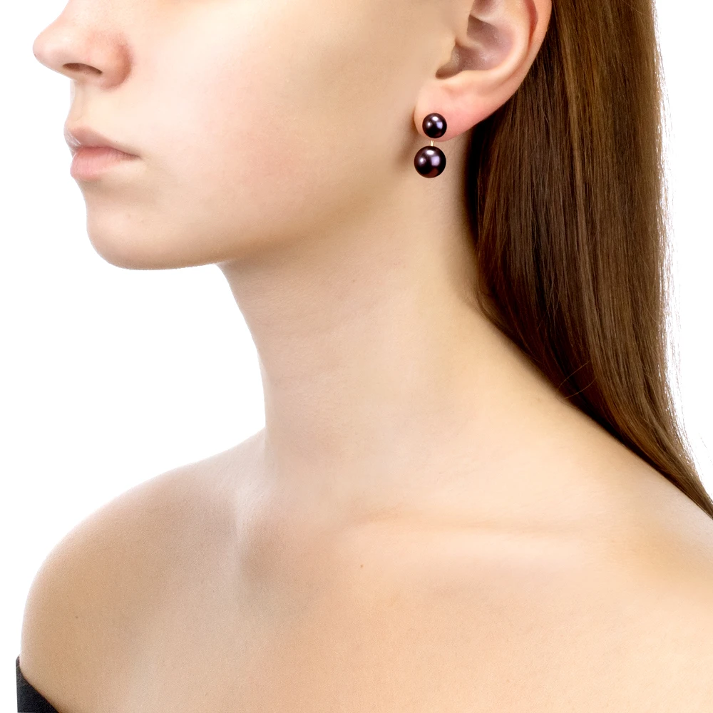 Двойные пусеты из серебра 925 пробы с желтым золотым покрытием украшены черным пресноводным жемчугом. Форма жемчужин - "пуговица" (сплющенная), блеск перламутра очень яркий, качество жемчуга очень высокое. В наличии есть серьги с жемчужинами различных оттенков черного цвета.