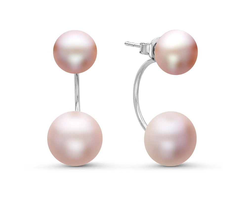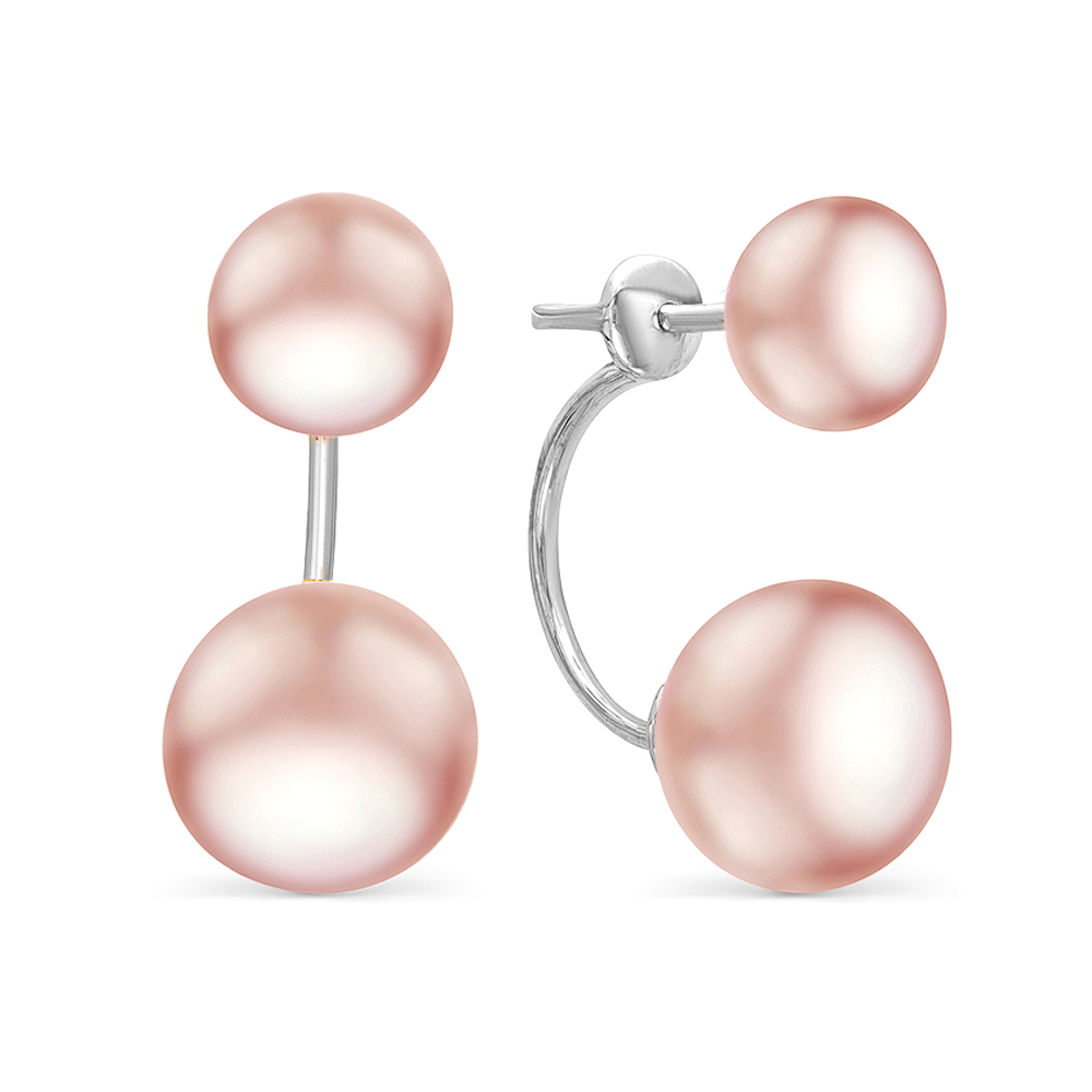 Двойные пусеты из серебра 925 пробы украшены розовым пресноводным жемчугом. Форма жемчужин - "пуговица" (сплющенная), блеск перламутра очень яркий, качество жемчуга очень высокое.