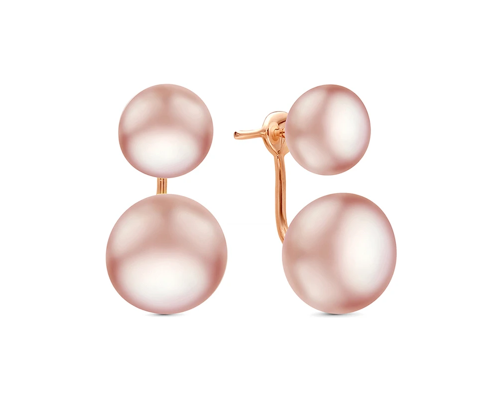 Двойные пусеты из серебра 925 пробы с покрытием "красное золото" украшены розовым пресноводным жемчугом. Форма жемчужин - "пуговица" (сплющенная), блеск перламутра очень яркий, качество жемчуга очень высокое.