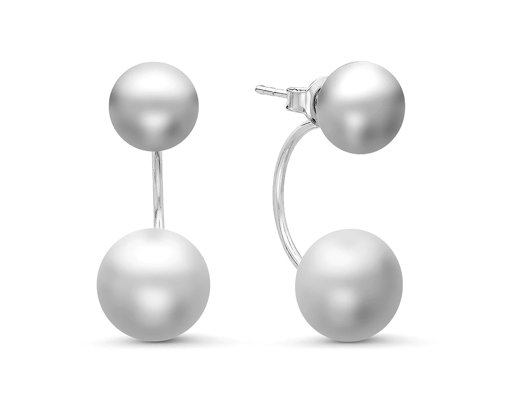 Двойные пусеты из серебра 925 пробы украшены серебристым пресноводным жемчугом. Качество жемчужин на серьгах наивысшее, жемчужины имеют очень яркий перламутровый блеск, гладкую, ровную поверхность, форма жемчужин сплющенная (пуговица).